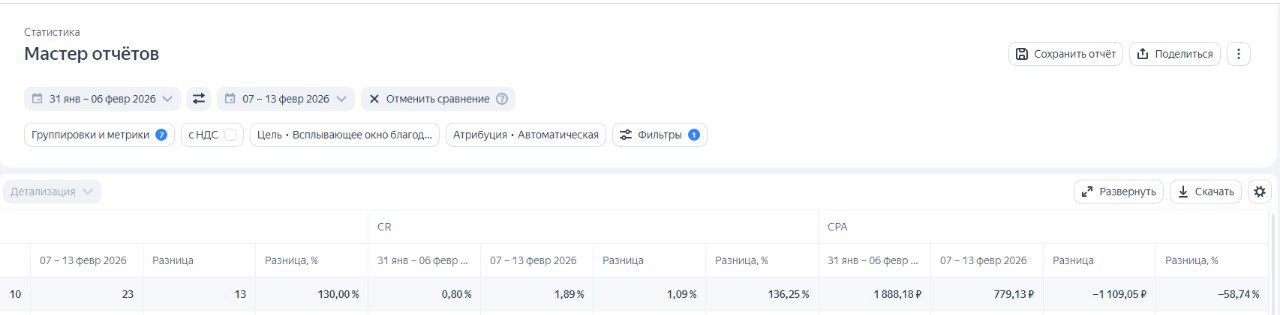 01.02–05.02 vs 06.02–10.02: конверсий 5→12 (+140%), CR 0,61%→1,38% (+126%), CPA 2 590→1 063 ₽ (−58,95%).
